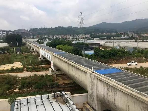 輸水線路工程11個標段于2010年上半年全面開工,2013年12月8日,隧洞混凝土澆筑全部完成,倒虹吸壓力鋼管安裝、渡槽混凝土澆筑施工全部完成,具備通水條件。